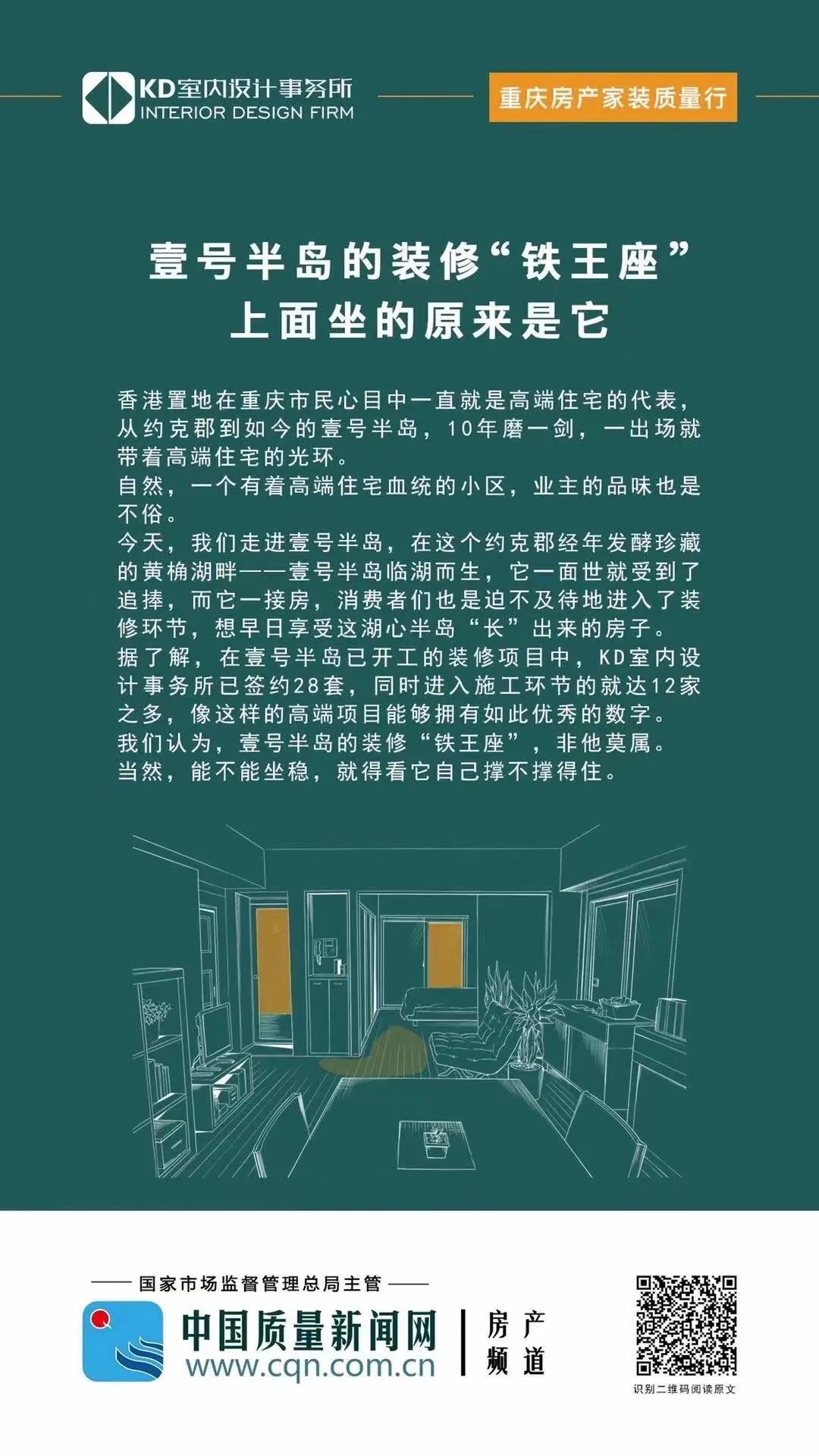 在壹号半岛已开工的装修项目中,KD室内设计事务所已签约28套,同时进入施工环节的就达12家之多,像这样的高端项目能够拥有如此优秀的数字,中国质量新闻网谈到:壹号半岛的装修“铁王座”,非KD莫属。