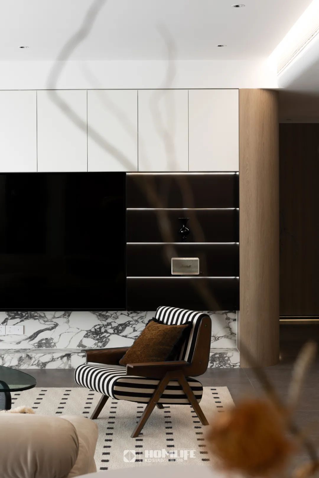 在木色柔雅圆润中,加入踢脚的隐藏灯带,烘托出方正的线条之美,让空间充满流感与张力。
