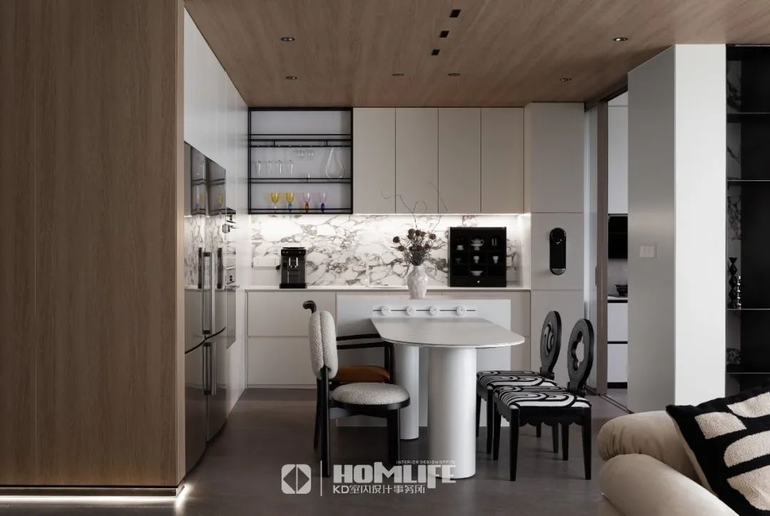可移动的边柜,方便未来场景的变换。木饰面与石材的花纹色彩结合,构建了一个简约艺术,充满温度格调的居所。