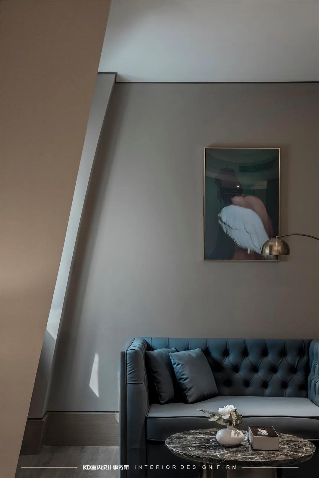 单独的休闲区域,蓝色的双人沙发,橙色的单人椅,鲜艳的色彩作为点缀,让房间不会冰冷。贴心的钓鱼灯设计,既可以满足临时的办公,又不会打扰到同伴的休息。