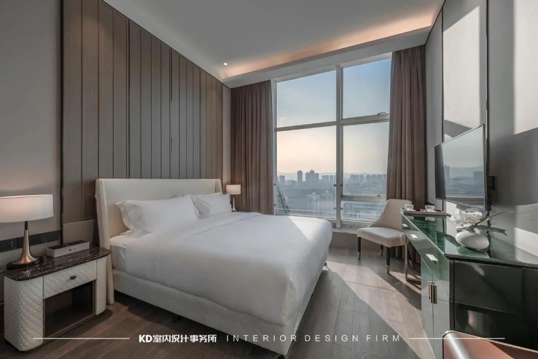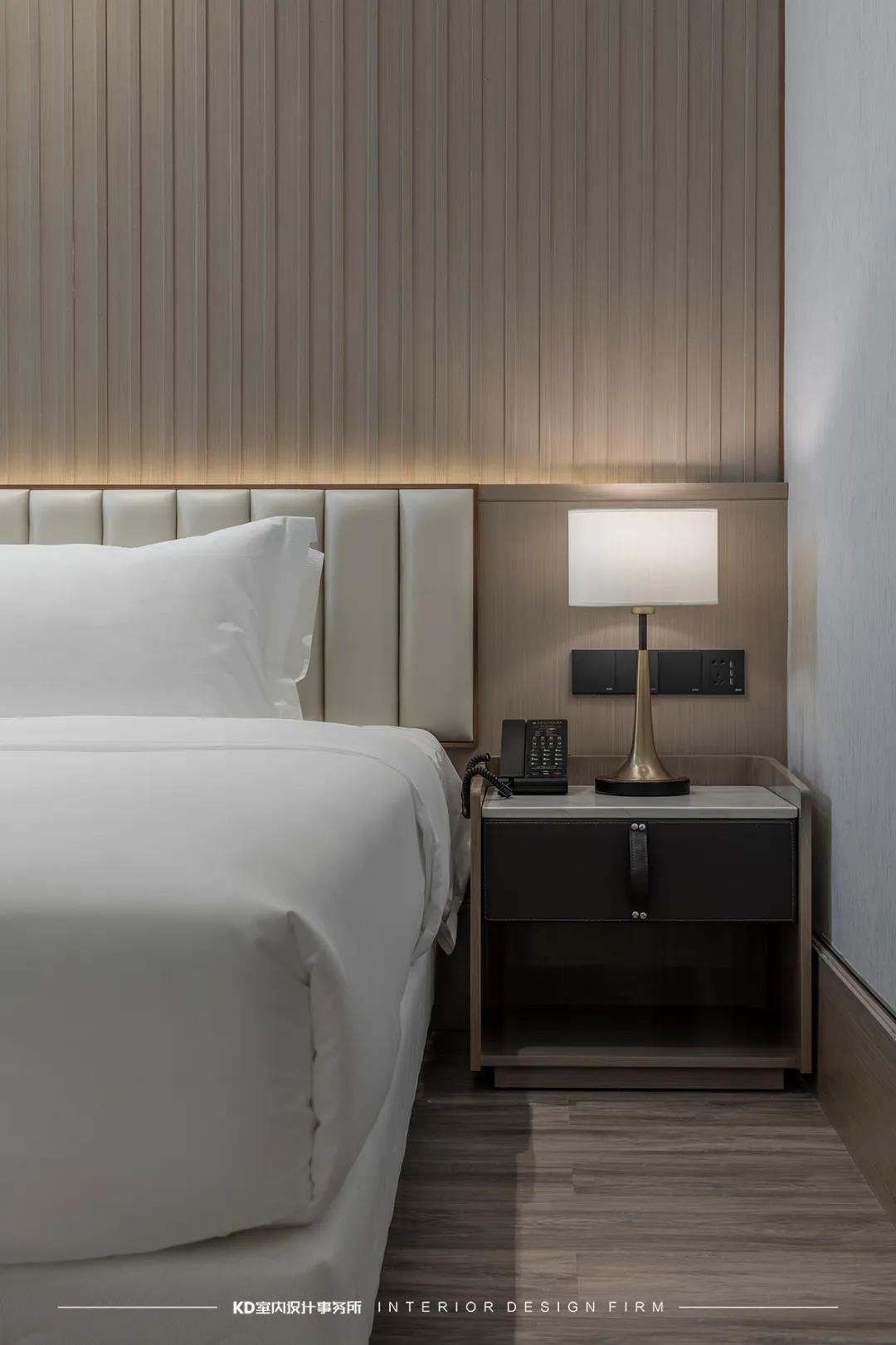 标准间与单间拥有相同的格局,相同的功能,房间的活动区域更大。不同造型的床头背景,视觉上增加了空间层次感。现代轻奢风的调性,为这个具有活力的城市的客人营造一种平静而奢华的氛围。