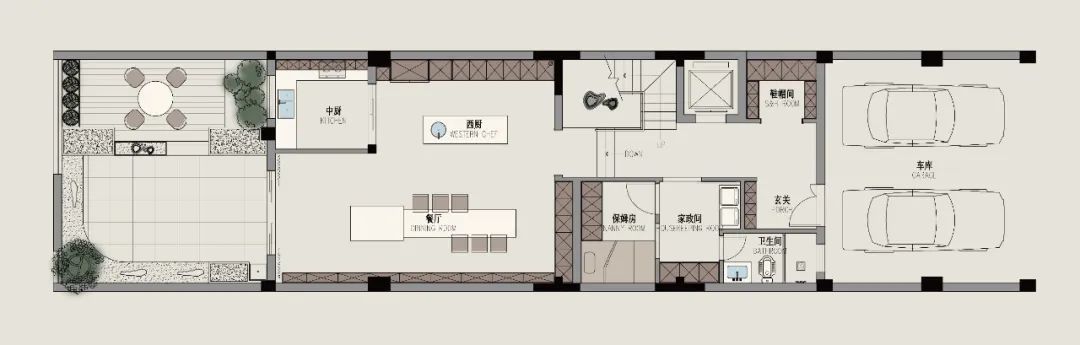 改造后 //负一层功能划分为车库、保姆间、家政间兼厨房餐厅,餐厅出去打造了私人花园。