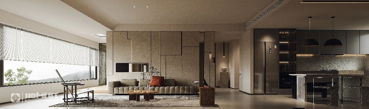 家的底色,在光线绝佳的落地窗前,如书的一角翻开,为视野带来静谧的仪式感,开放的格局在类似侘寂的低饱和色调中展开,搭配别致的墙面背景线条和小窗,质朴的自然中显露出当代的简洁,蕴含巧思。