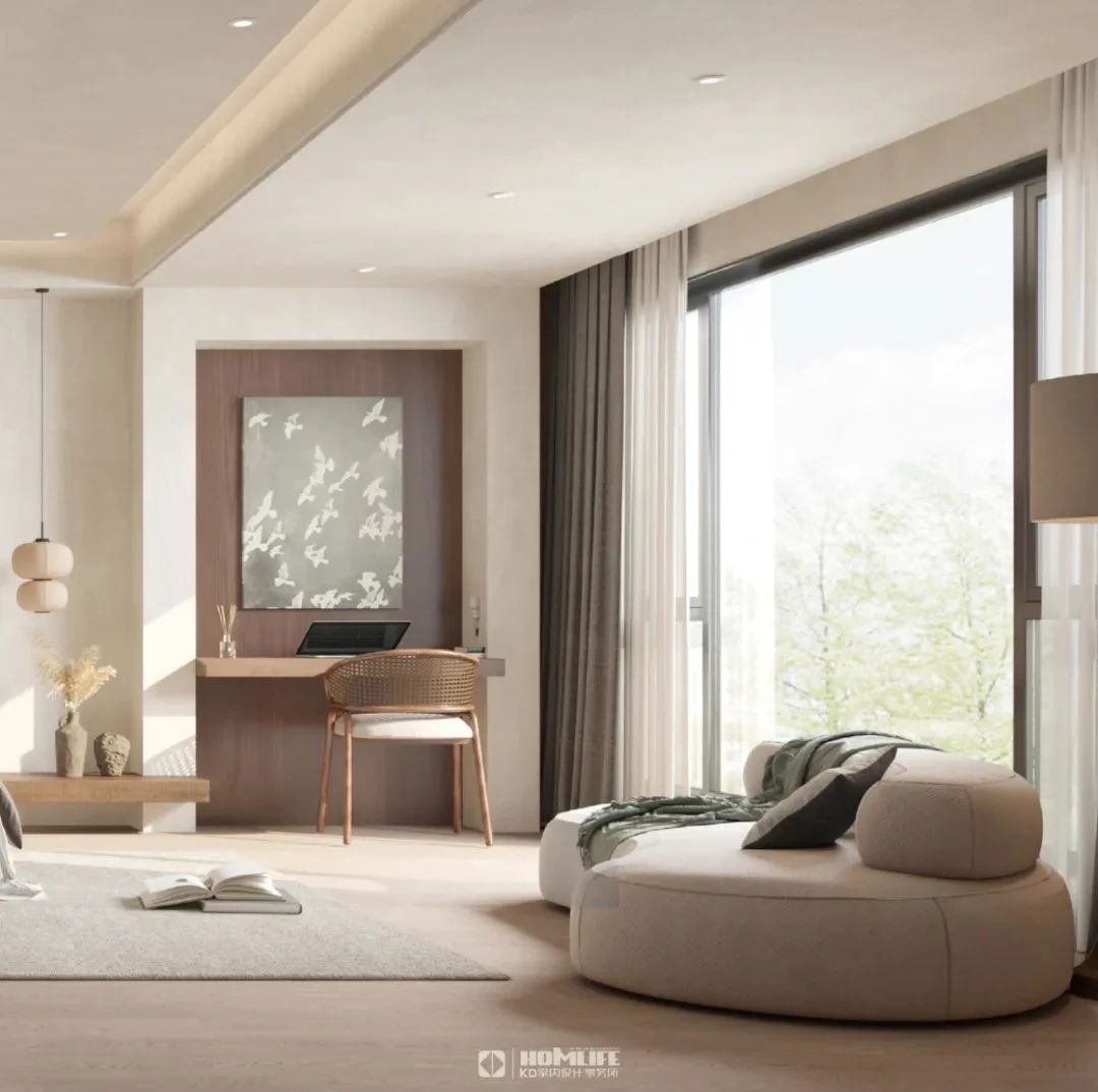 The large area of natural colors in the master bedroom fills the interior, enriching the warmth of living. In the clear spatial tone, it blends with indirect design, showcasing a comfortable and gentle side of home.