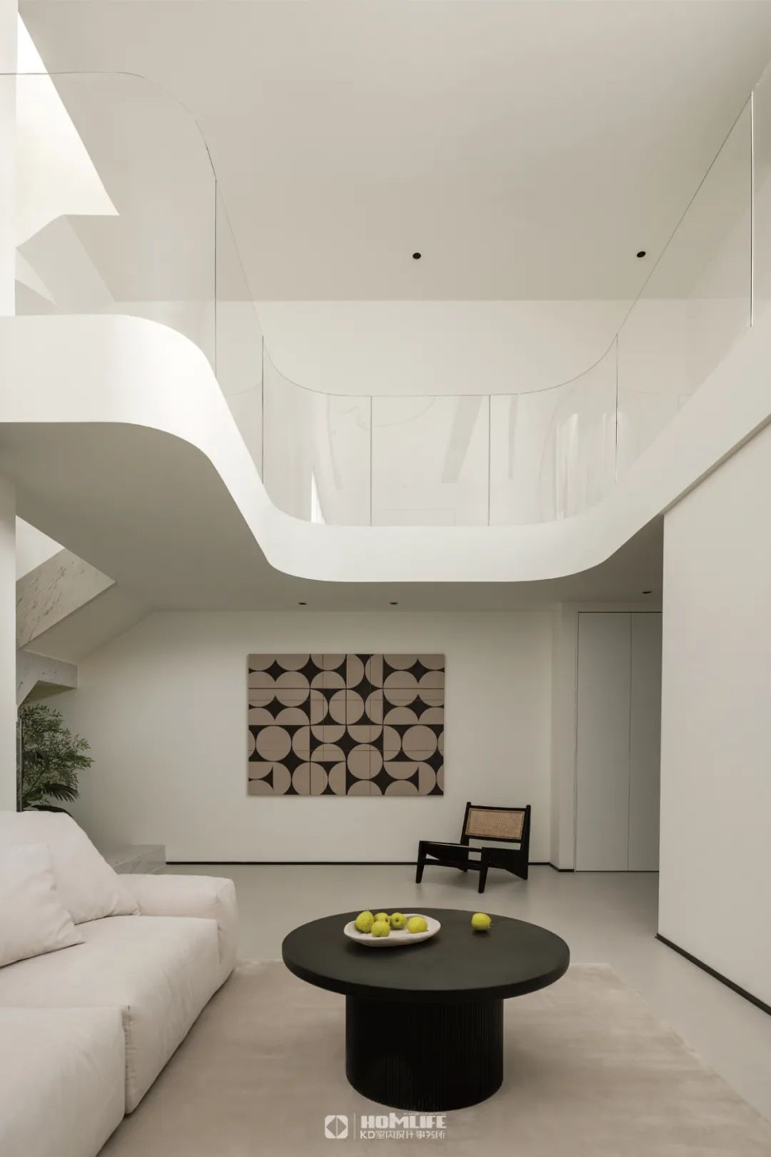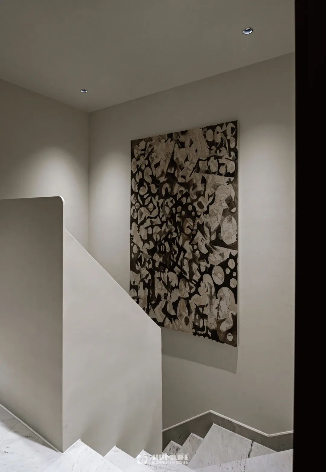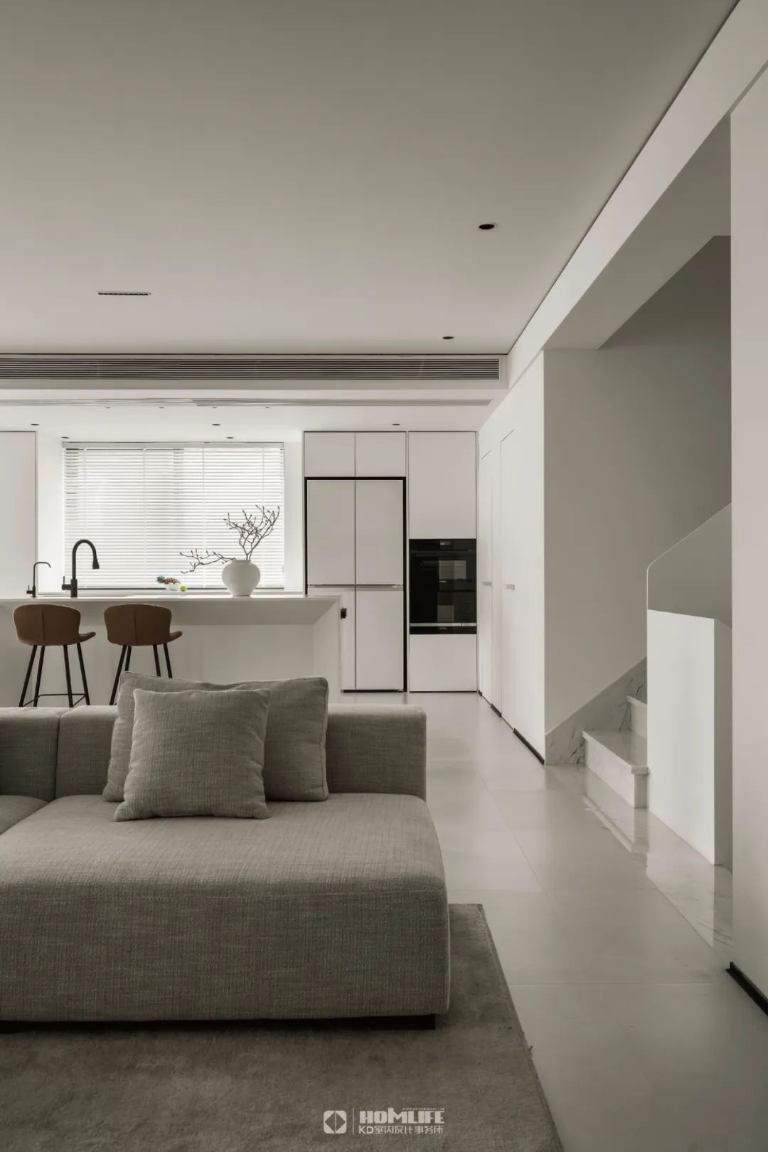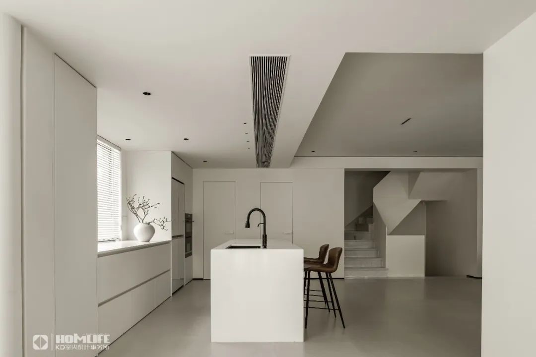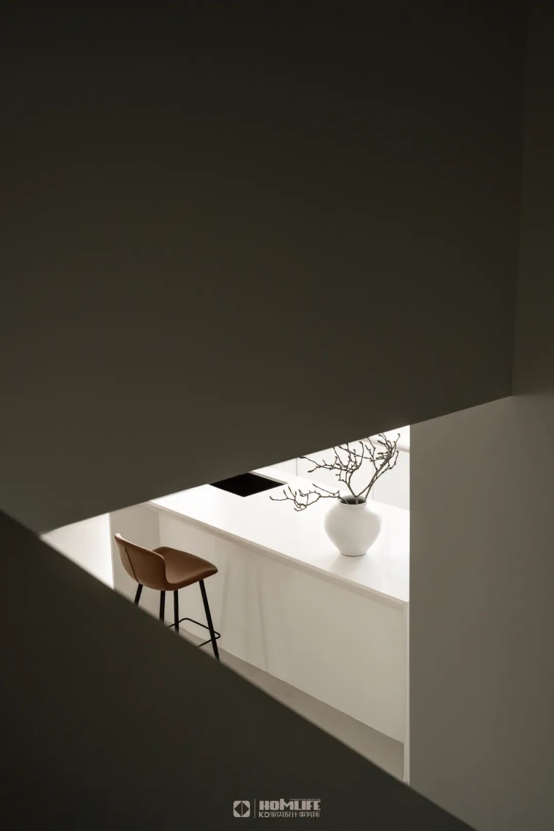 吧台与楼梯相映成趣,建筑于极简,楼梯的线条让家多了几分自我的境界,无意间切割出建筑的几何景,由内而外以光为序,回归自我。