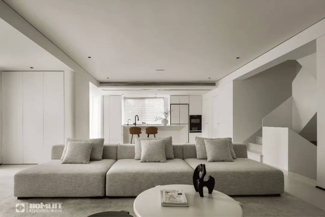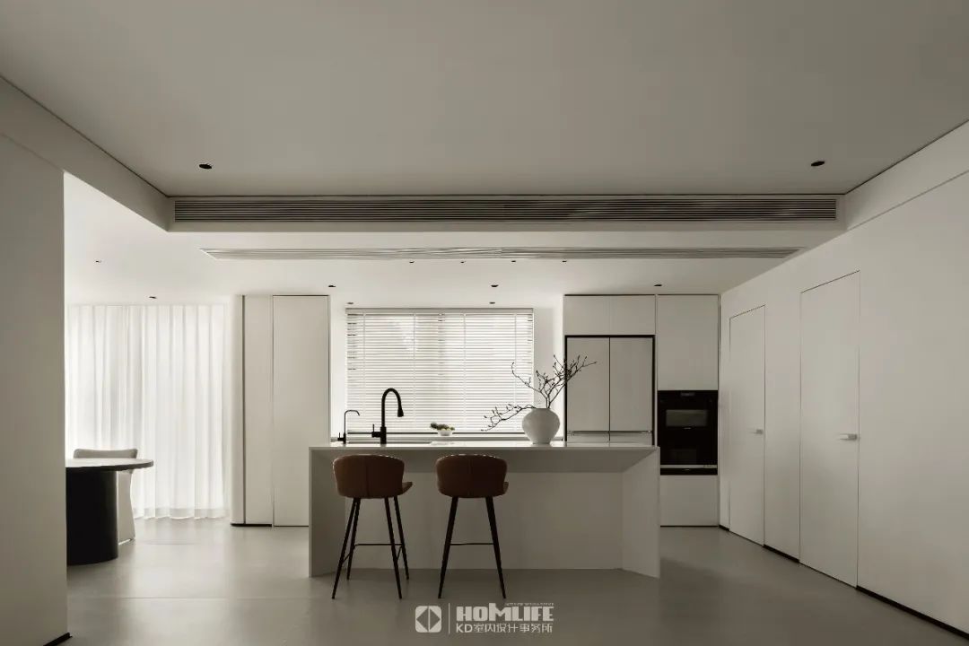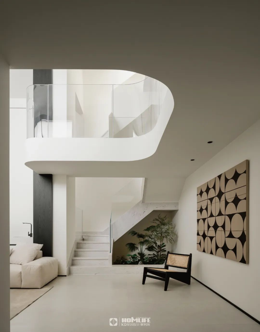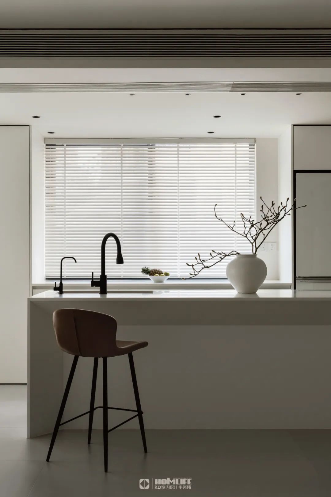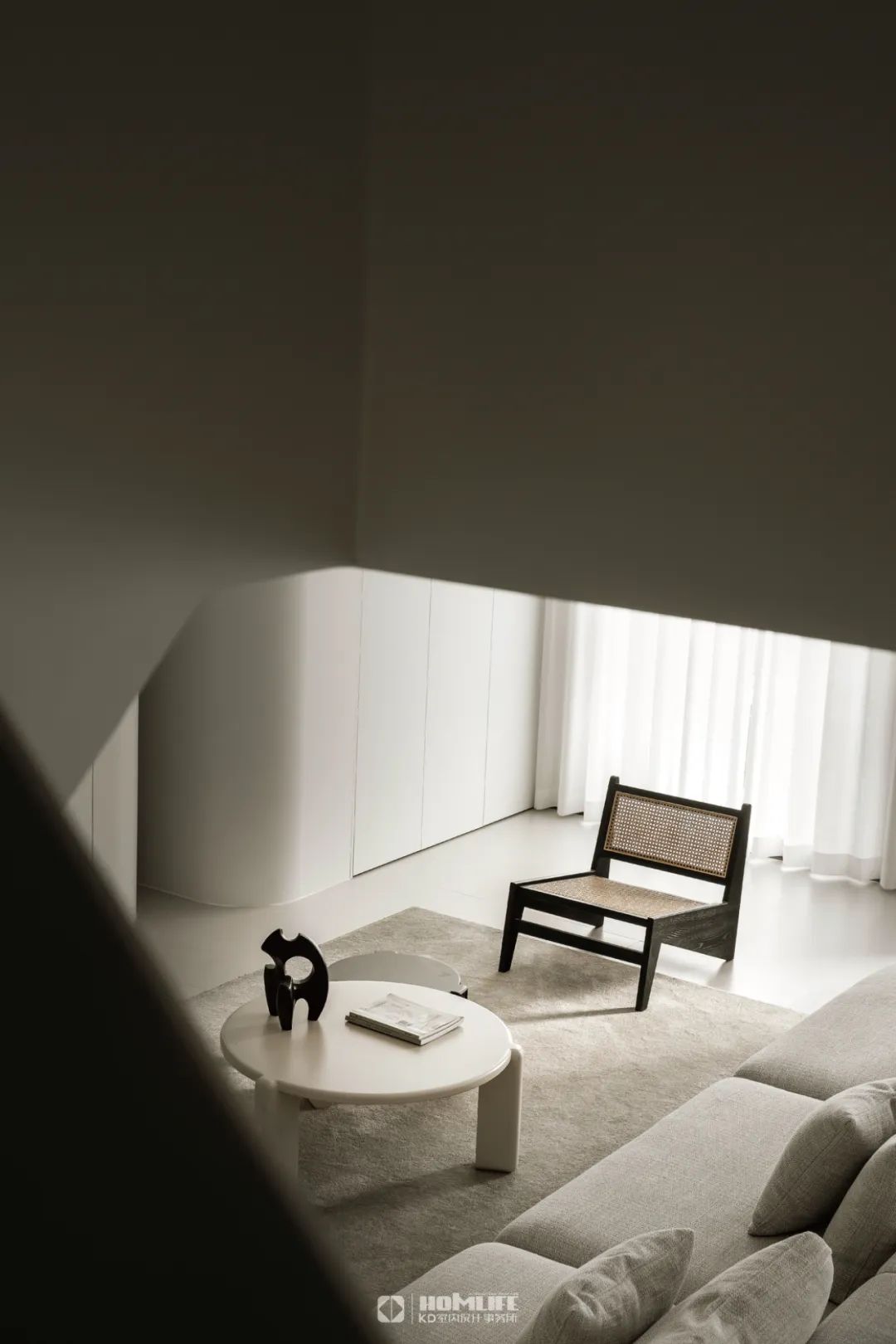 吧台与楼梯相映成趣,建筑于极简,楼梯的线条让家多了几分自我的境界,无意间切割出建筑的几何景,由内而外以光为序,回归自我。