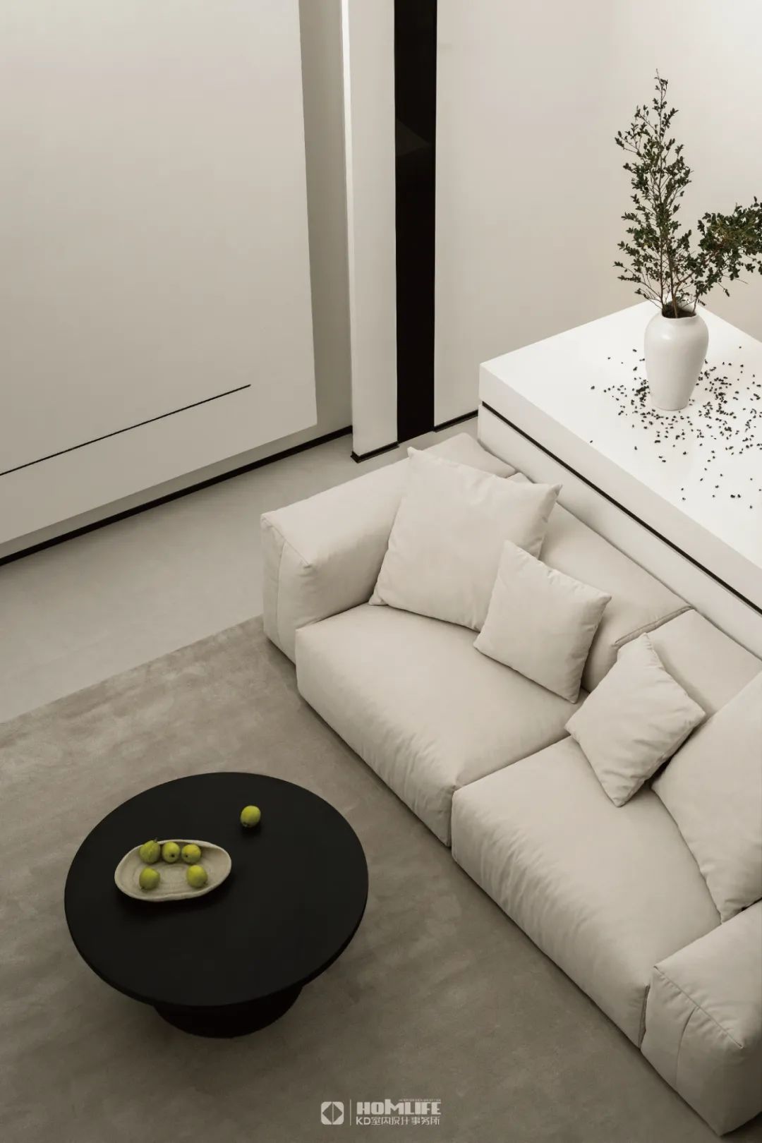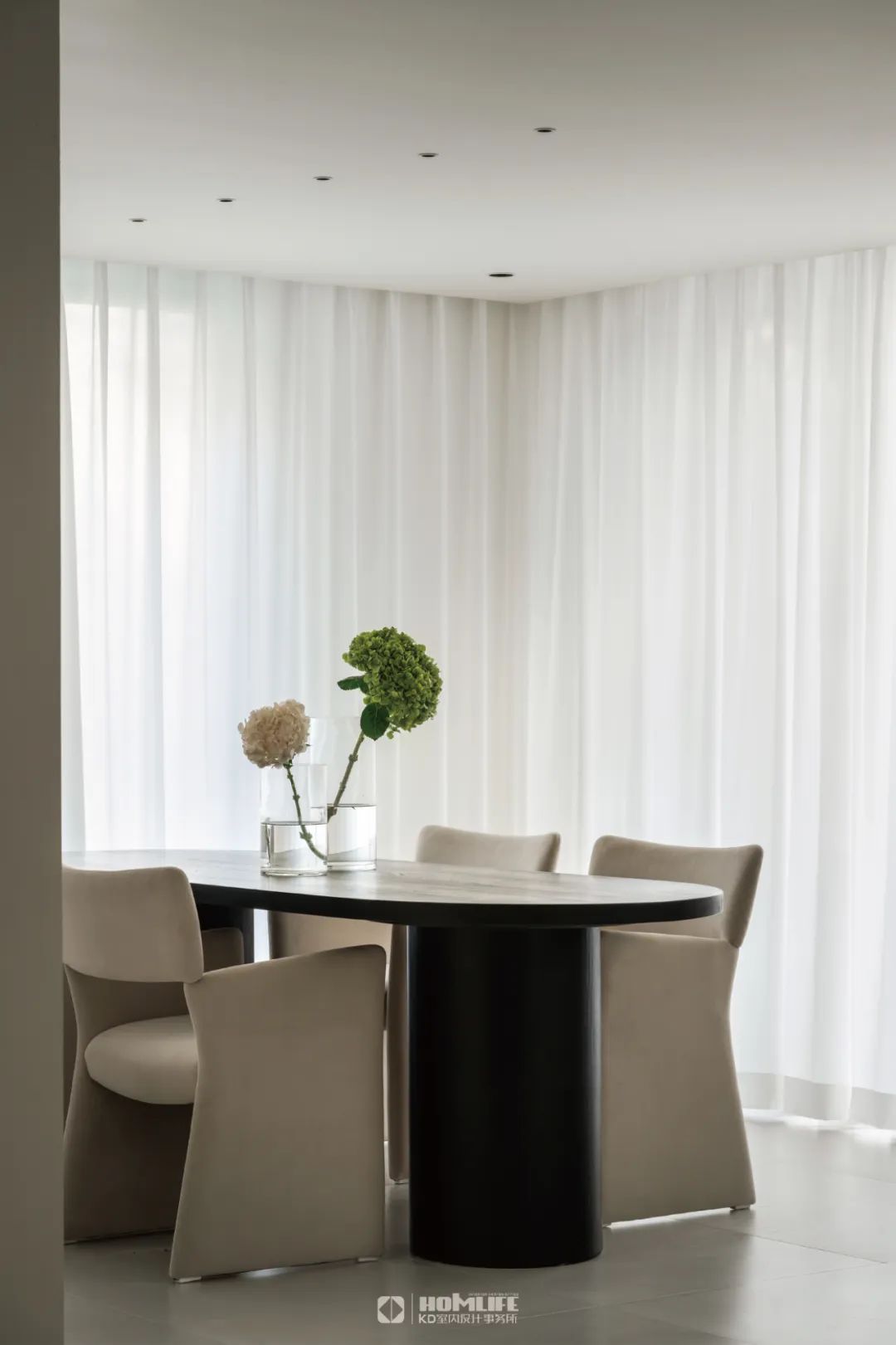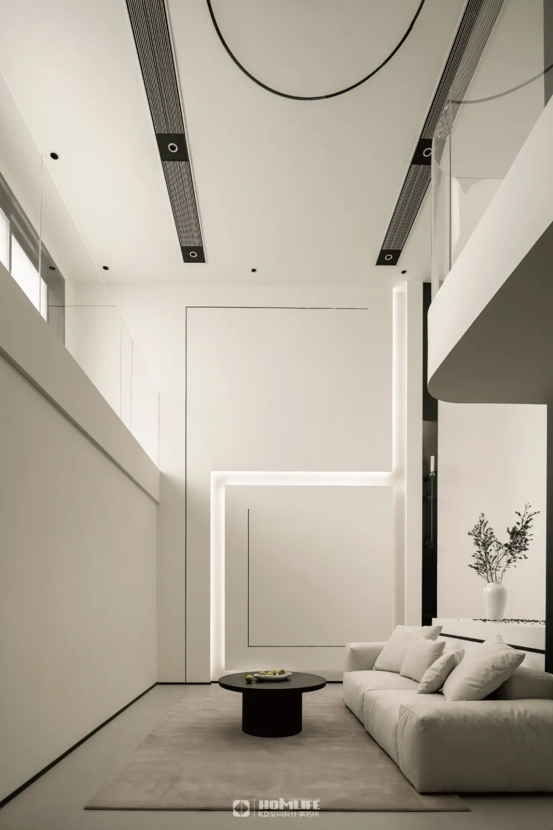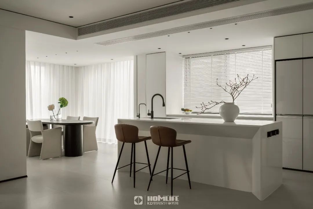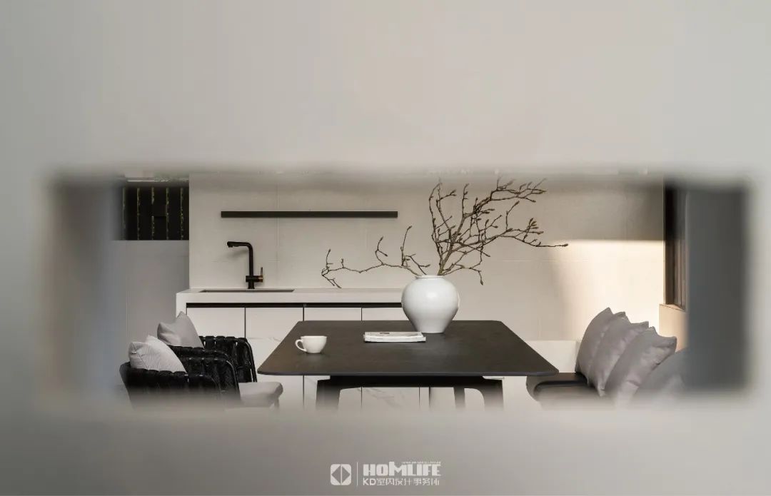 吧台与楼梯相映成趣,建筑于极简,楼梯的线条让家多了几分自我的境界,无意间切割出建筑的几何景,由内而外以光为序,回归自我。